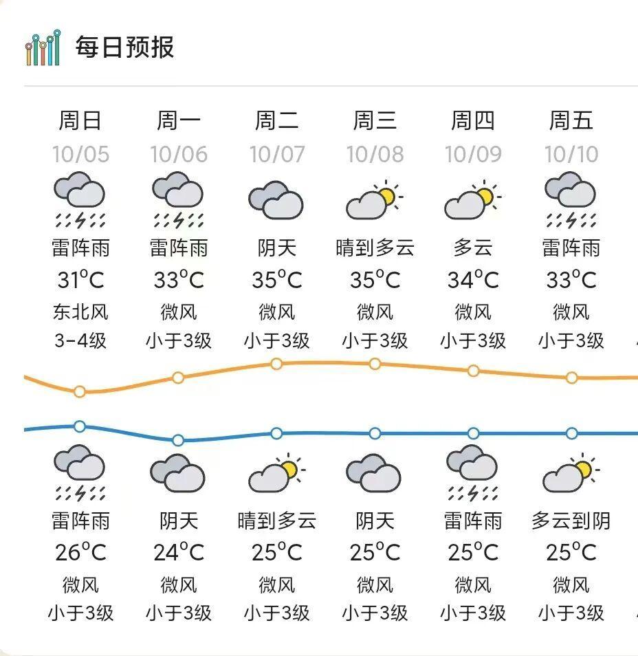 ▲10月6日(中秋节)白天,多云,有分散雷阵雨;夜间,多云,间中可见月光;最低气温23~25℃,最高气温32~34℃;